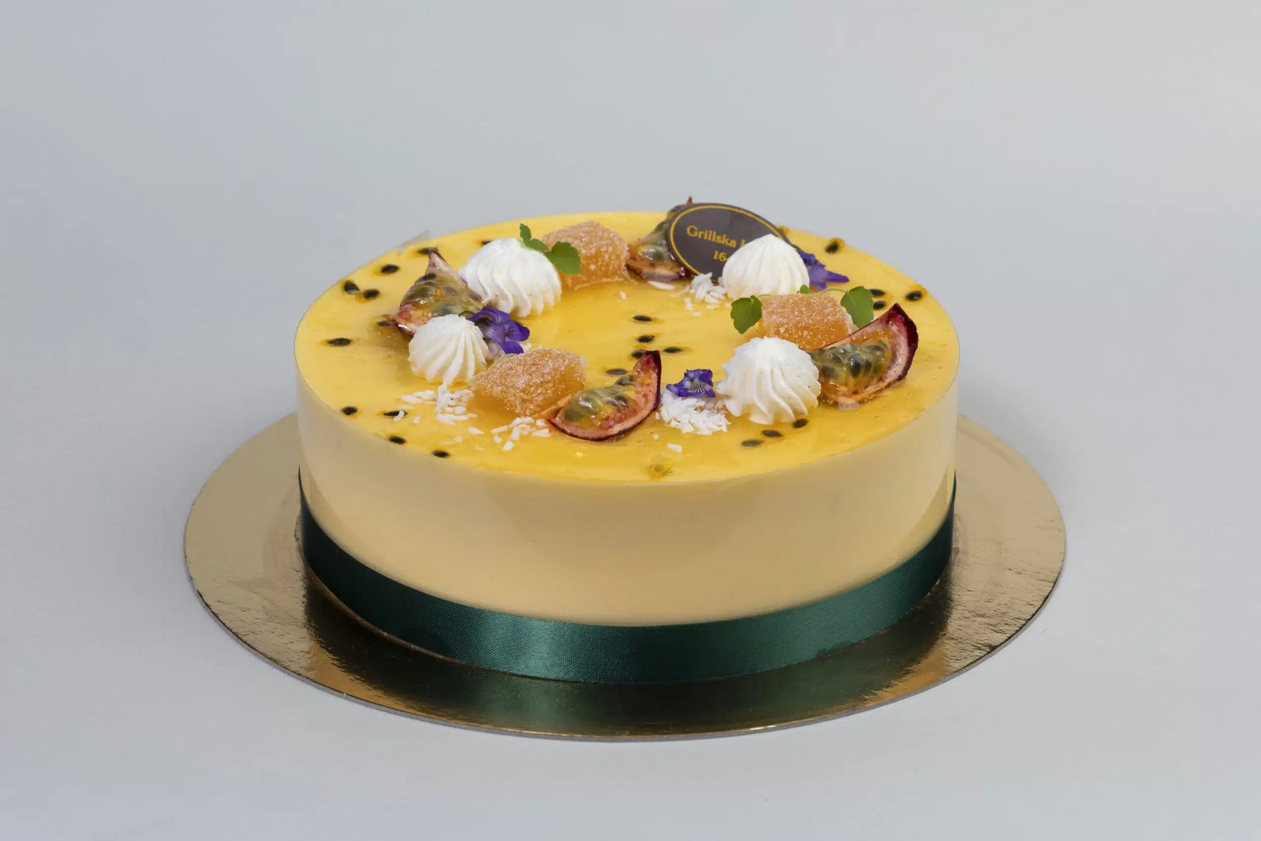 Denna exotiska skapelse innehåller kokosmarängbottnar, en len kokosbrûlée med lime som sedan omsluts av en sötsyrlig mango-& passionsmousse. Dekoreras med en vackert spritsad vaniljpannacotta, passionsfrukt, kuber av vår egen kokta passionsmarmelad, kokos & atsinakrasse. Laktosfri & utan tillsatt gluten.